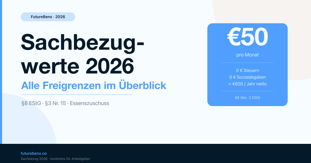 Die Sachbezugswerte 2026 bieten erheblichen Spielraum für steuerfreie Vergütungsoptimierung. Wer die Kombination aus Sachbezugsfreigrenze, ÖPNV-Zuschuss, Essenszuschuss und Gesundheitsförderung konsequent nutzt, kann je Mitarbeitenden über €3.700 Nettovorteil pro Jahr schaffen — ohne Sozialabgaben, ohne Einkommensteuer.